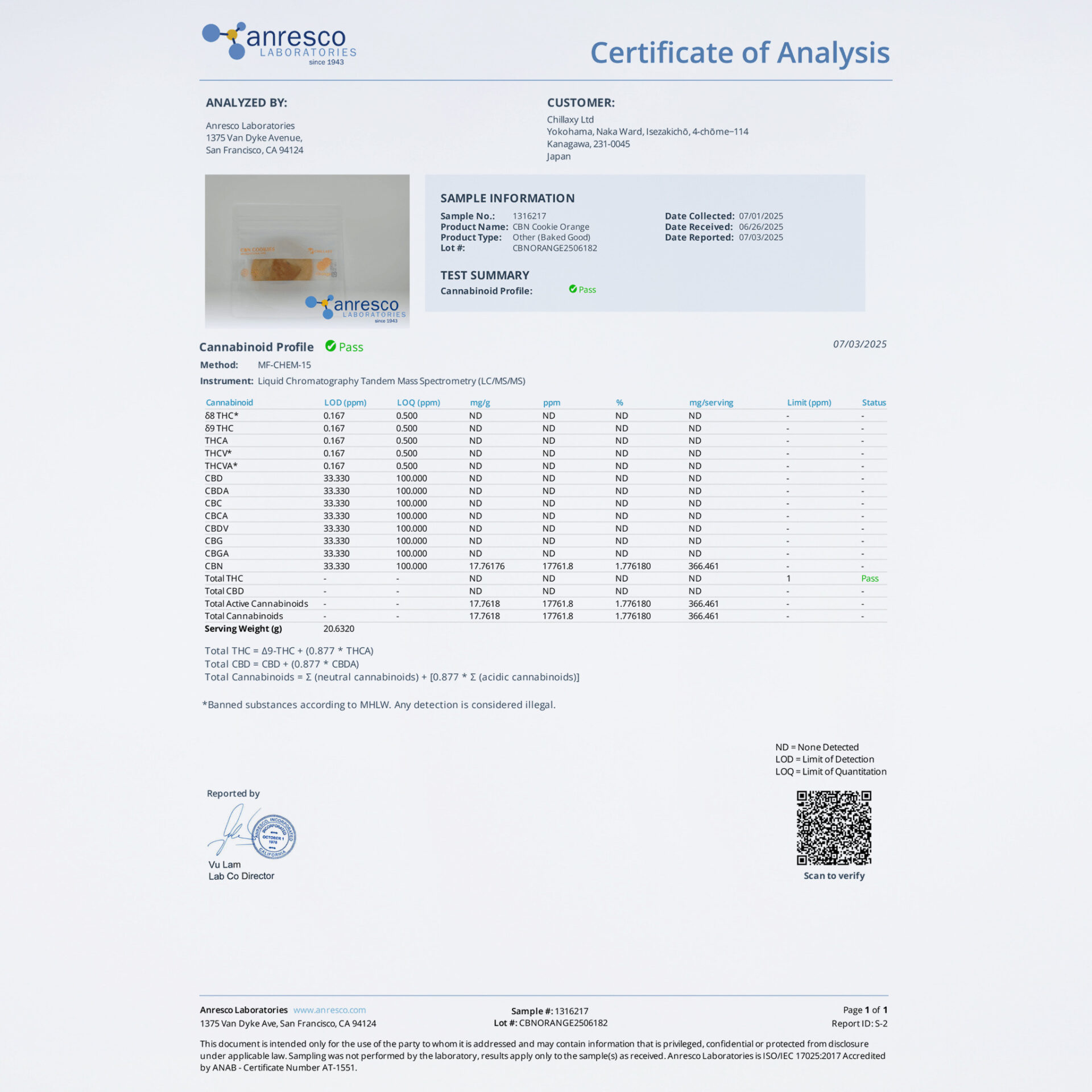 CHILLAXY(チラクシー)は、2024年12月に施行された改正大麻取締法後、すべての最終製品ロットを第三者機関へ順次提出し、成分分析証明書(Certificate of Analysis=COA)を取得・公開しています。これにより、お客さま自身が「製品が合法かどうか」を確認できると同時に、当社の厳格な安全基準を可視化しています。