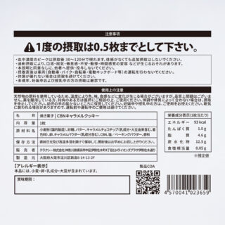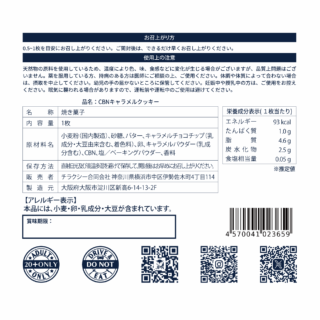 ・原材料:小麦粉(国内製造)、砂糖、バター、キャラメルチョコチップ(乳成分・大豆由来含む、着色料)、卵、キャラメルパウダー(乳成分含む)、CBN、塩、ベーキングパウダー、香料