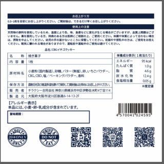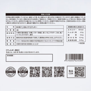 ・原材料:小麦粉(国内製造)、砂糖、バター(無塩)、卵、いちごパウダー、CBG、塩、ベーキングパウダー、香料