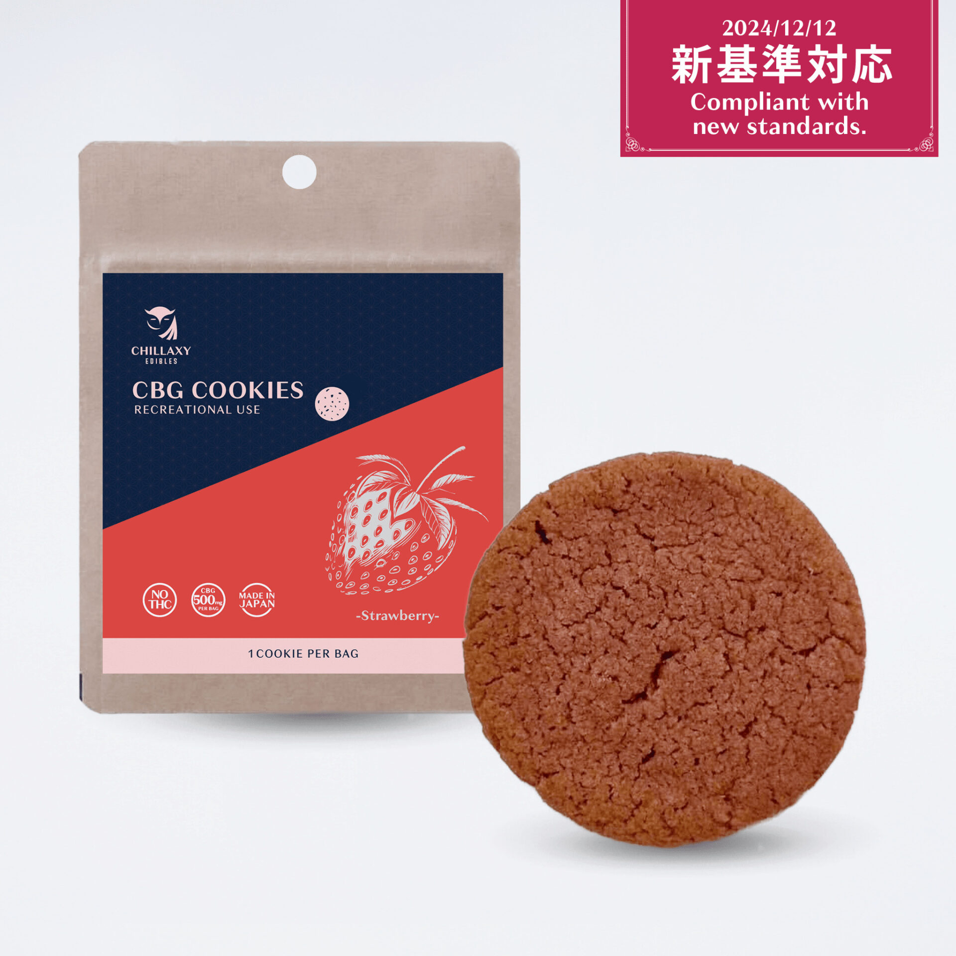 クッキー1枚にCBG 500mgを配合した高濃度CBGクッキーです。ストロベリーの華やかな香りと、ほどよい甘さが織りなす、贅沢な味わいをお楽しみいただけます。高濃度CBGと食べごたえのあるボリュームのため、数回に分けてお楽しみいただけます。半枚食べると動けるアクティブ感、1枚食べるとしっかり満足感を得ることができるレクリエーション性があります。日中のアクティブに動きたいとき、クリエイティブな作業などにおすすめです。お酒との併用はお控えください。