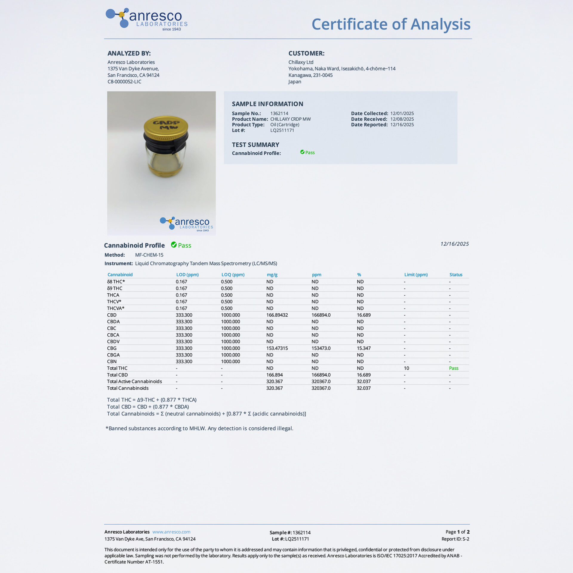 カンナビノイド配合率:CRDP 60%,CBG 20%,CBD 5%,CBN 5%,Terpene 10%