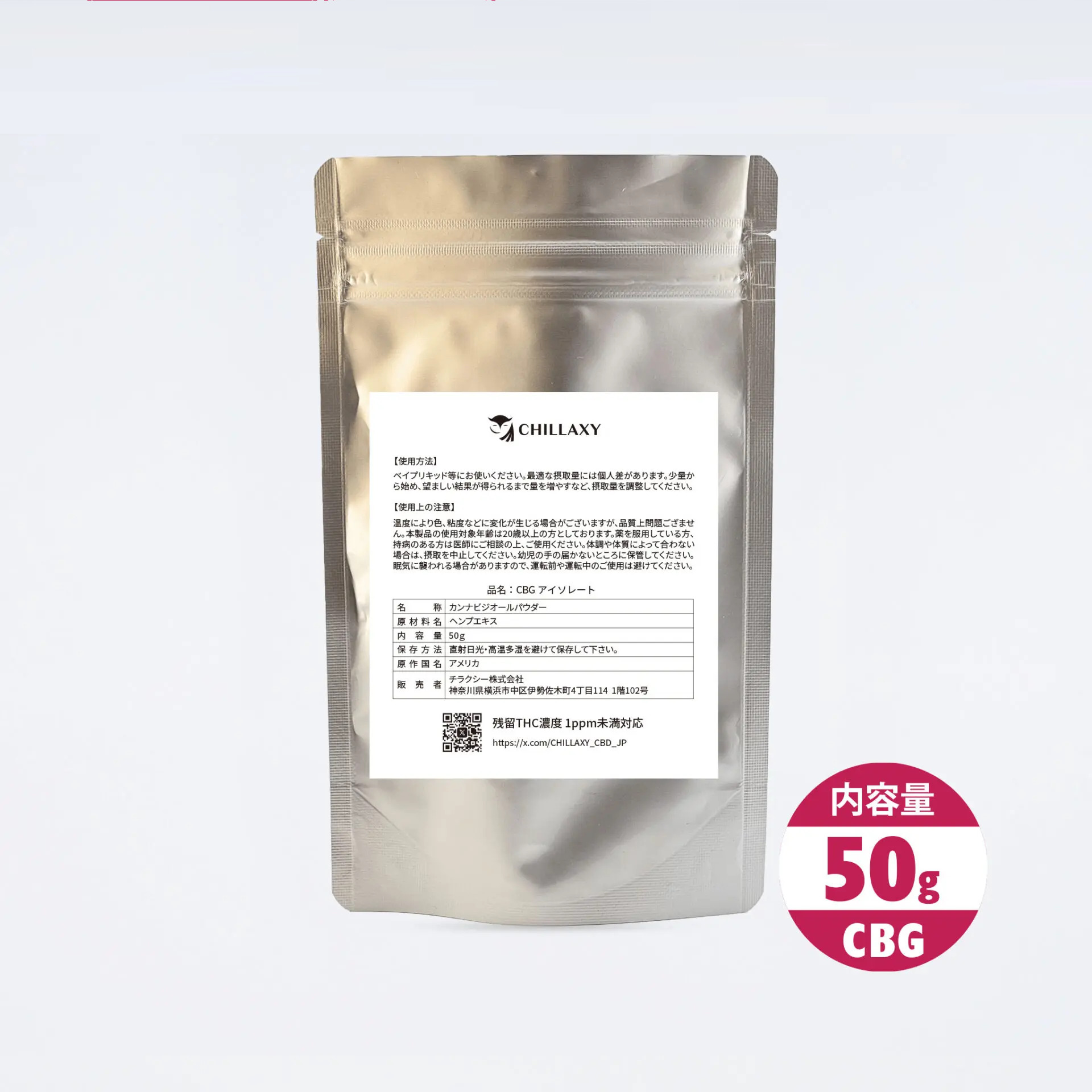 国産CBGアイソレートです。CBGは「母なるカンナビノイド」と呼ばれる、様々なカンナビノイドの中でも重要なレアカンナビノイドです。CBGはCBDよりも幅広い利用価値があるものと期待されています。サティバ寄りのカンナビノイドです。THC未検出の原料なので、安心安全にご利用頂けます。本品は、カンナビノイドの知識をお持ちの事業者向けの商品のため、一般消費者の方のご購入・ご使用はお控えください。