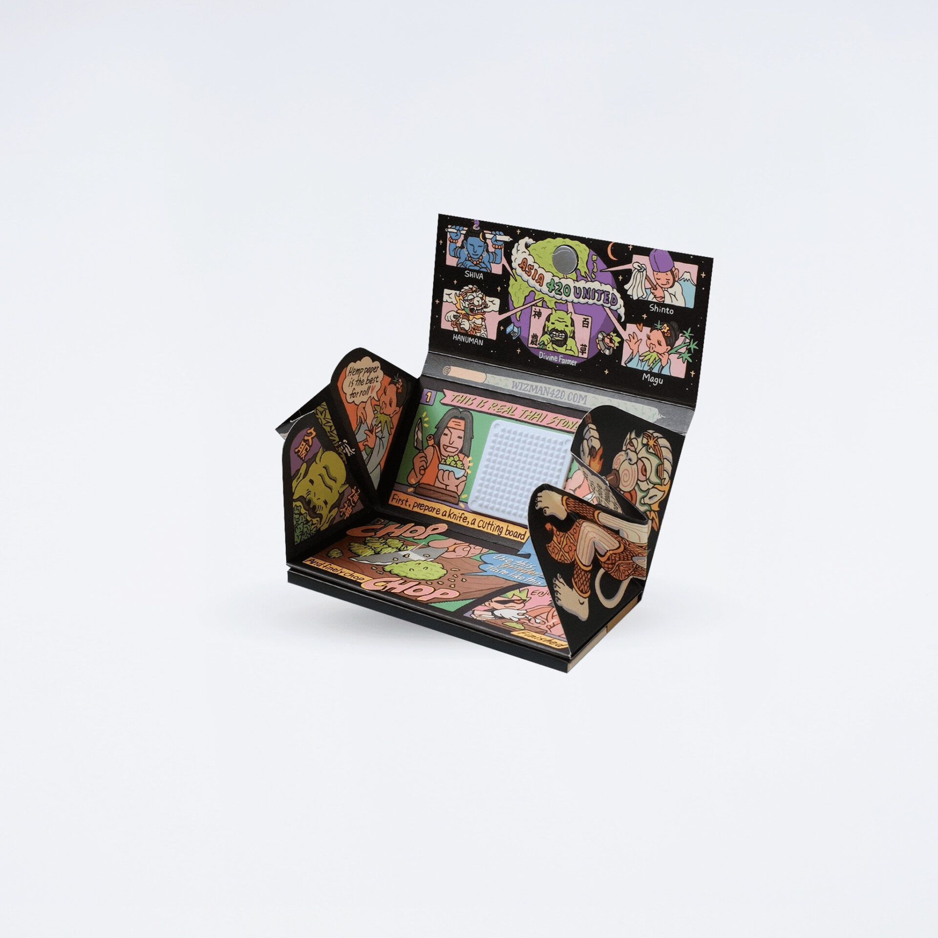 ペーパー、フィルターチップ、トレイ、グラインダーが1つに纏まっているオールインワンデザインのキングサイズローリングペーパーです。屋外での持ち運びにも便利です。ライスペーパーは無添加の天然素材が使用されており、馴染みのある味わいです。適量のタバコの葉をとり、チップと一緒に巻いてご使用ください。2〜3人で吸う場合はキングサイズがおすすめです。